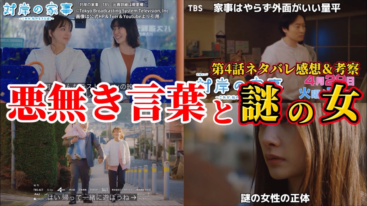 TBS公式Youtube. “『対岸の家事』4/8(火) 第2話 専業主婦と育休中のエリートパパが出会う…!?【TBS】”.Youtube. 2025年4月1日. https://www.youtube.com/watch?v=TT9TIVmkw3I, (参照2025-04-02).